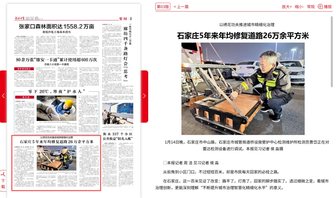 “十四五”以来,石家庄市清理私搭乱建、占道经营等乱象,整治破损路面、建筑立面等短板,累计完成2000余条小街小巷的整治提升。5年来,年均修复道路超过26万平方米、便道超过12万平方米。这不仅是量的积累,更是治理理念的更新——始终将人的感受置于城市治理的中心。