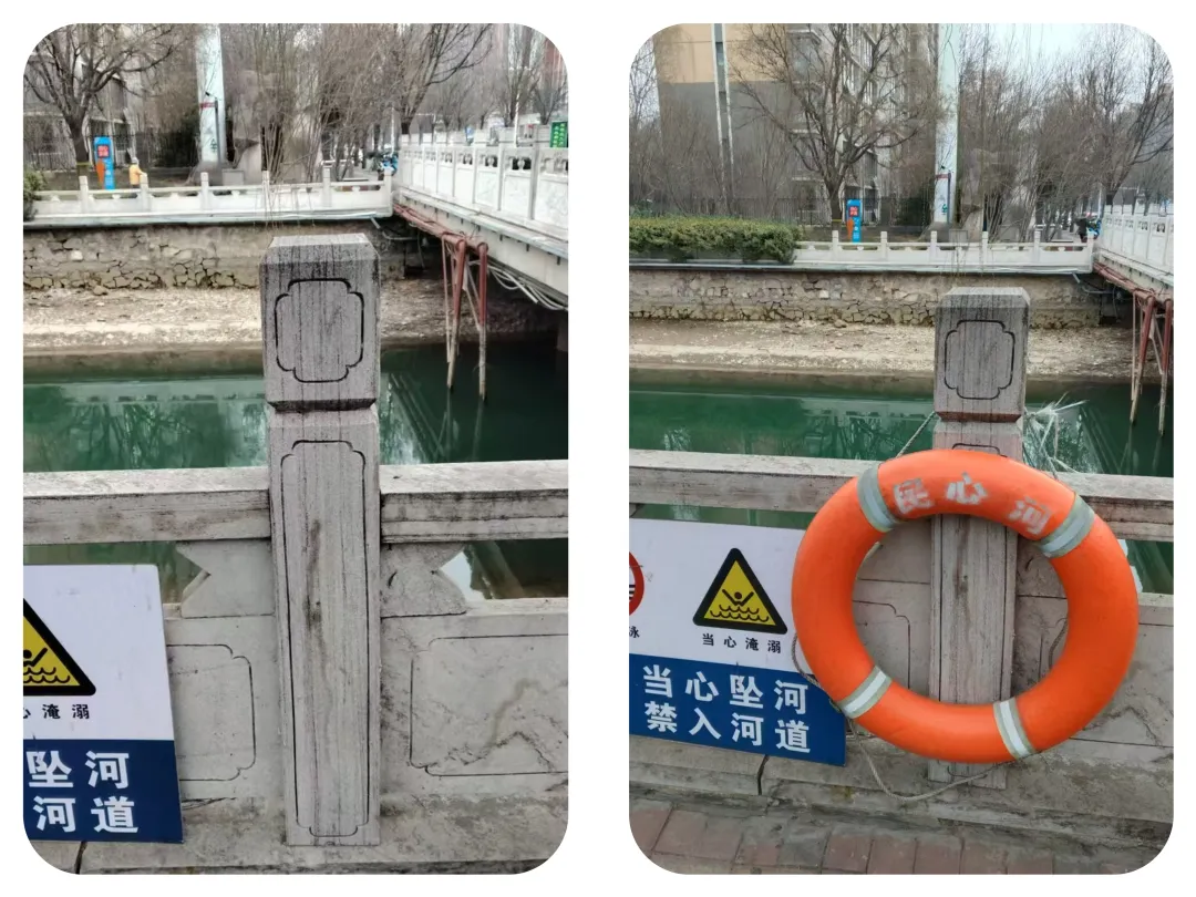 民心河河道管理所西线工作人员徒步对河道水质、挡墙、橡胶坝、栏杆等河道设施损坏、警示牌丢失、污损和防汛隐患等情况进行细致排查。经过检查,发现民心河西线天翼路北侧桥头救生圈缺失,立即安排管护人员处理,于1小时内安放了新的救生圈,消除了安全隐患。